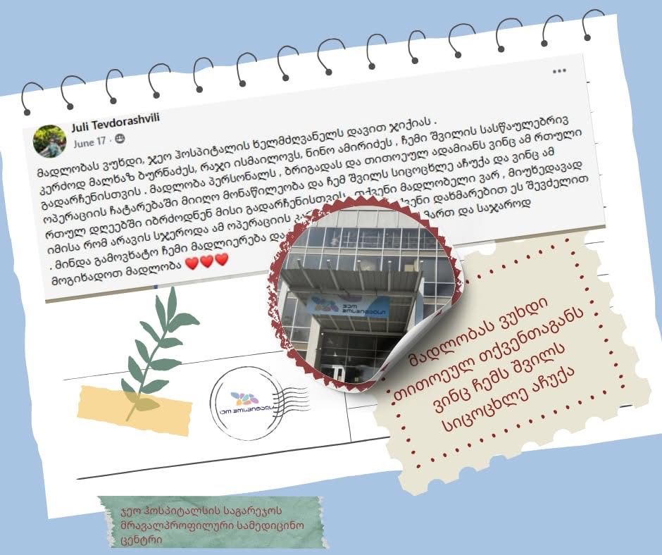 პაციენტის დედა: ,,ყველაზე დიდი გამარჯვება ჩემთვის იყო! მადლობას ვუხდი “ჯეო ჰოსპიტალსი”-ს ხელმძღვანელს დავით ჯიქიას. ასევე მალხაზ ბურნაძეს, რაჯი ისმაილოვს, ნინო ამირიძეს ჩემი შვილის სასწაულებრივი გადარჩენისთვის. განსაკუთრებული მადლობა გულმკერდის ქირურგს ირაკლი კონიაშვილს ლომის წილის შეტანისთვის ამ პაციენტის როგორც ოპერაციის, ასევე მკურნალობის პროცესსა და გამოჯანმრთელებაში. მადლობა პერსონალს, ბრიგადას და თითოეულ ადამიანს, ვინც ამ რთული ოპერაციის ჩატარებაში მიიღო მონაწილეობა და ჩემ შვილს სიცოცხლე აჩუქა, და ვინც ამ რთულ დღეებში იბრძოდნენ მისი გადარჩენისთვის. თქვენი მადლობელი ვარ! მიუხედავად იმისა, რომ არავის სჯეროდა ამ ოპერაციის კარგად ჩავლის, თქვენი დახმარებით ეს შევძელით!”